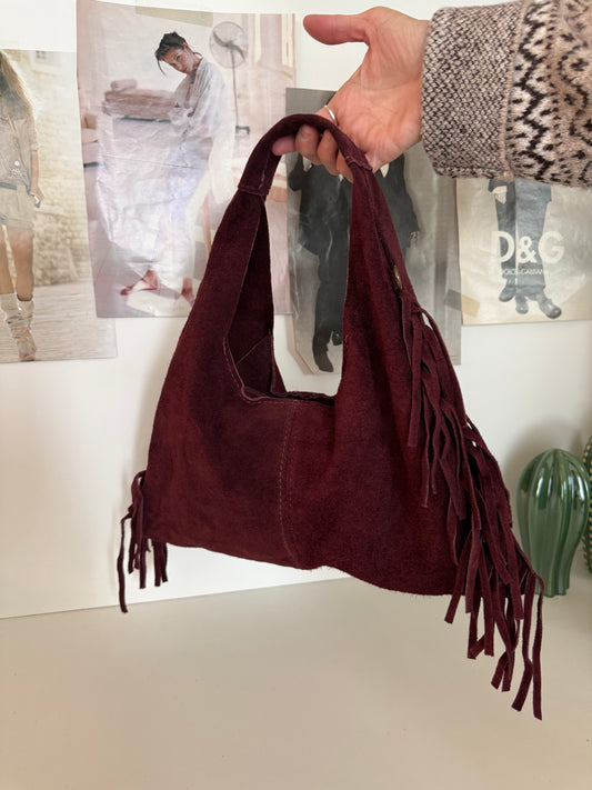 Borsetta “hobo” scamosciata con frange - Bordeux - in vera pelle