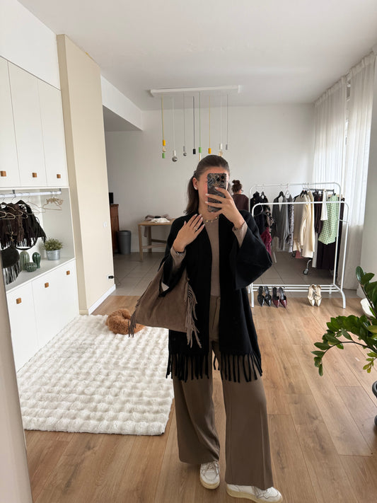 Borsetta “square” scamosciata con frange - Fango - in vera pelle