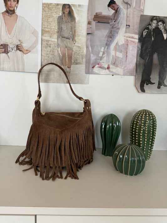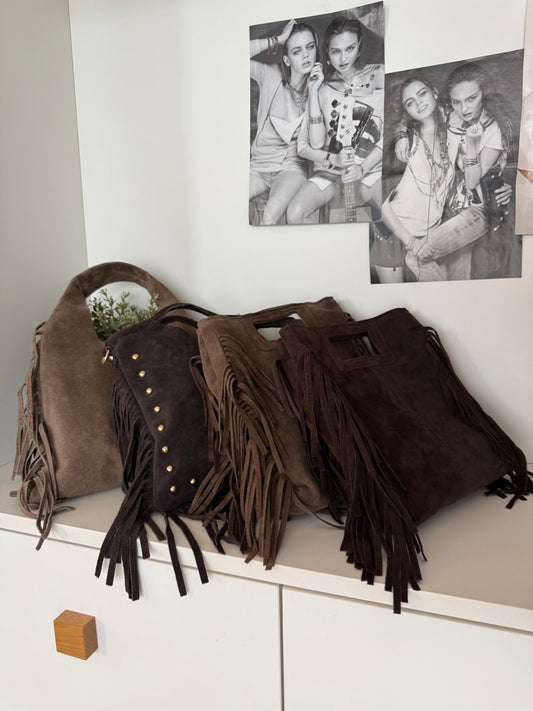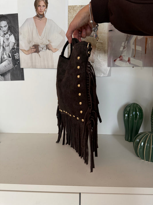 Borsetta “borchie” scamosciata con frange - Marrone - in vera pelle