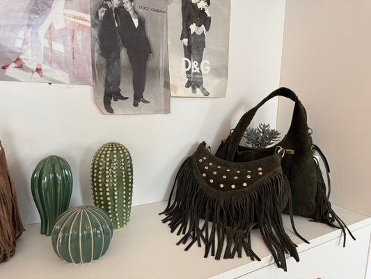 Borsetta “hobo borchie” scamosciata con frange - Verdone - in vera pelle