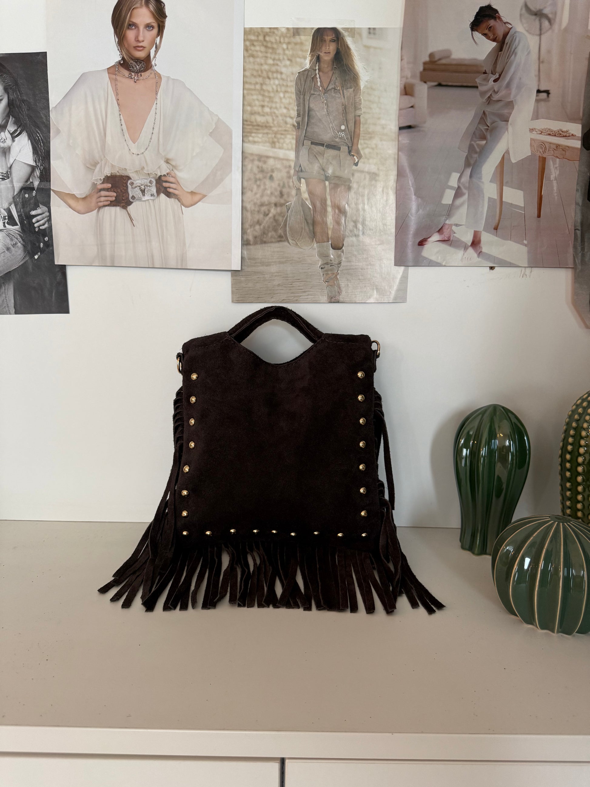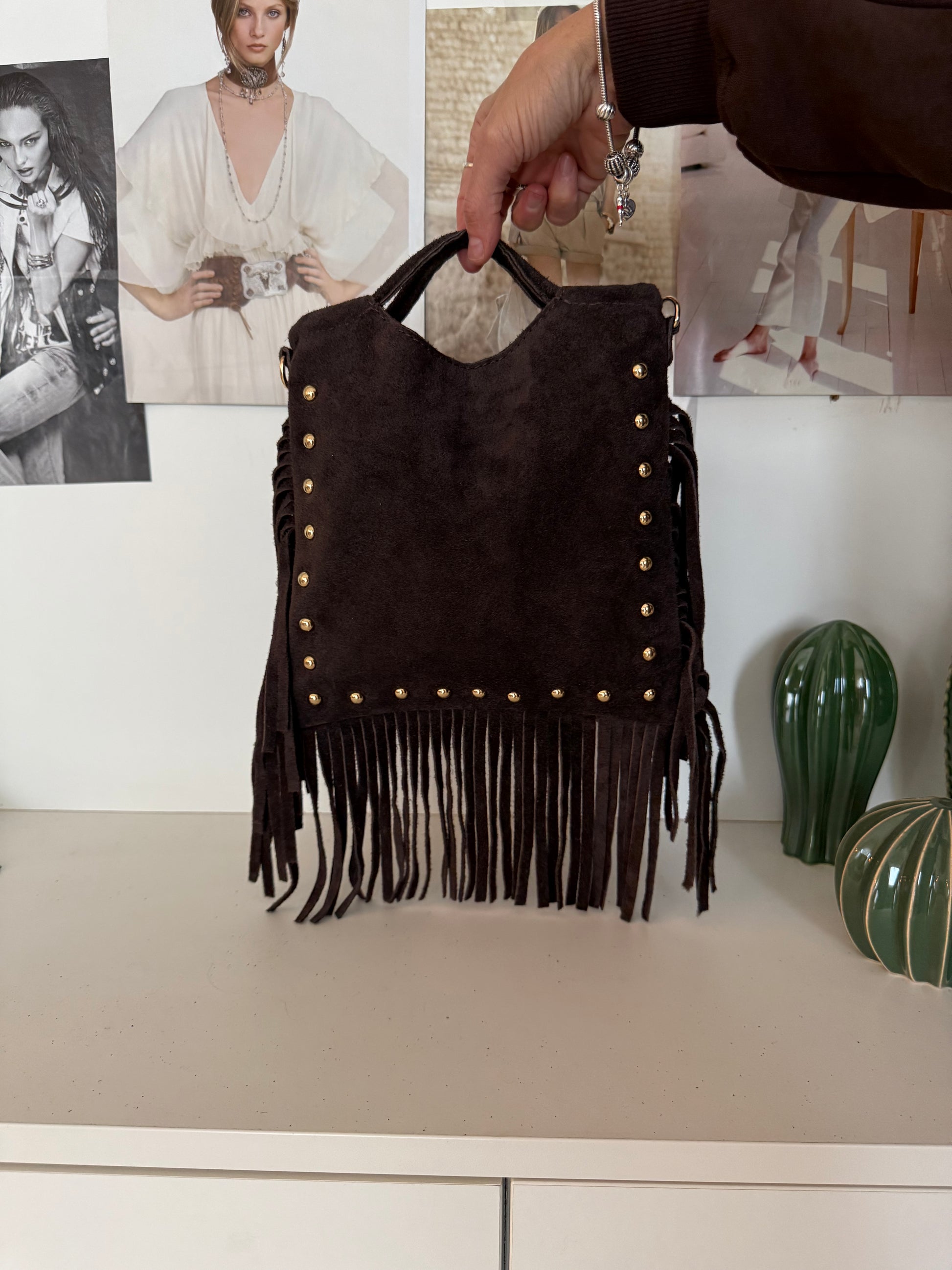 Borsetta “borchie” scamosciata con frange - Marrone - in vera pelle