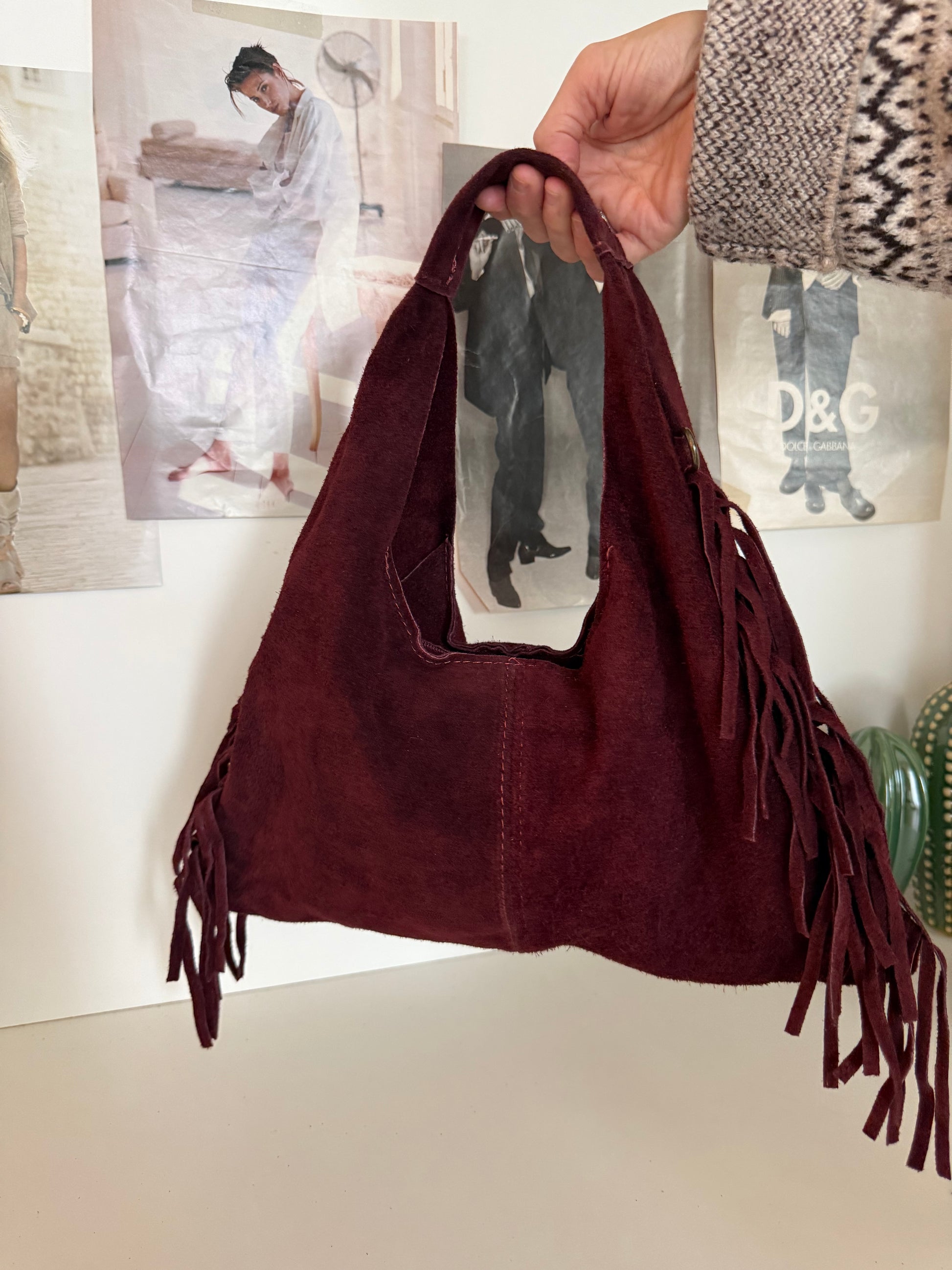 Borsetta “hobo” scamosciata con frange - Bordeux - in vera pelle