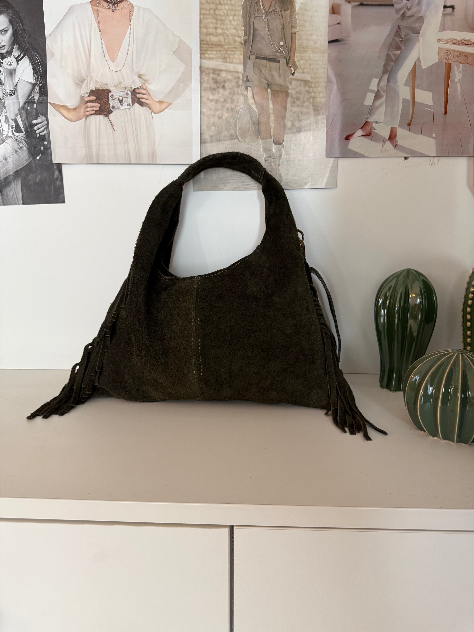 Borsetta “hobo” scamosciata con frange - Verdone - in vera pelle