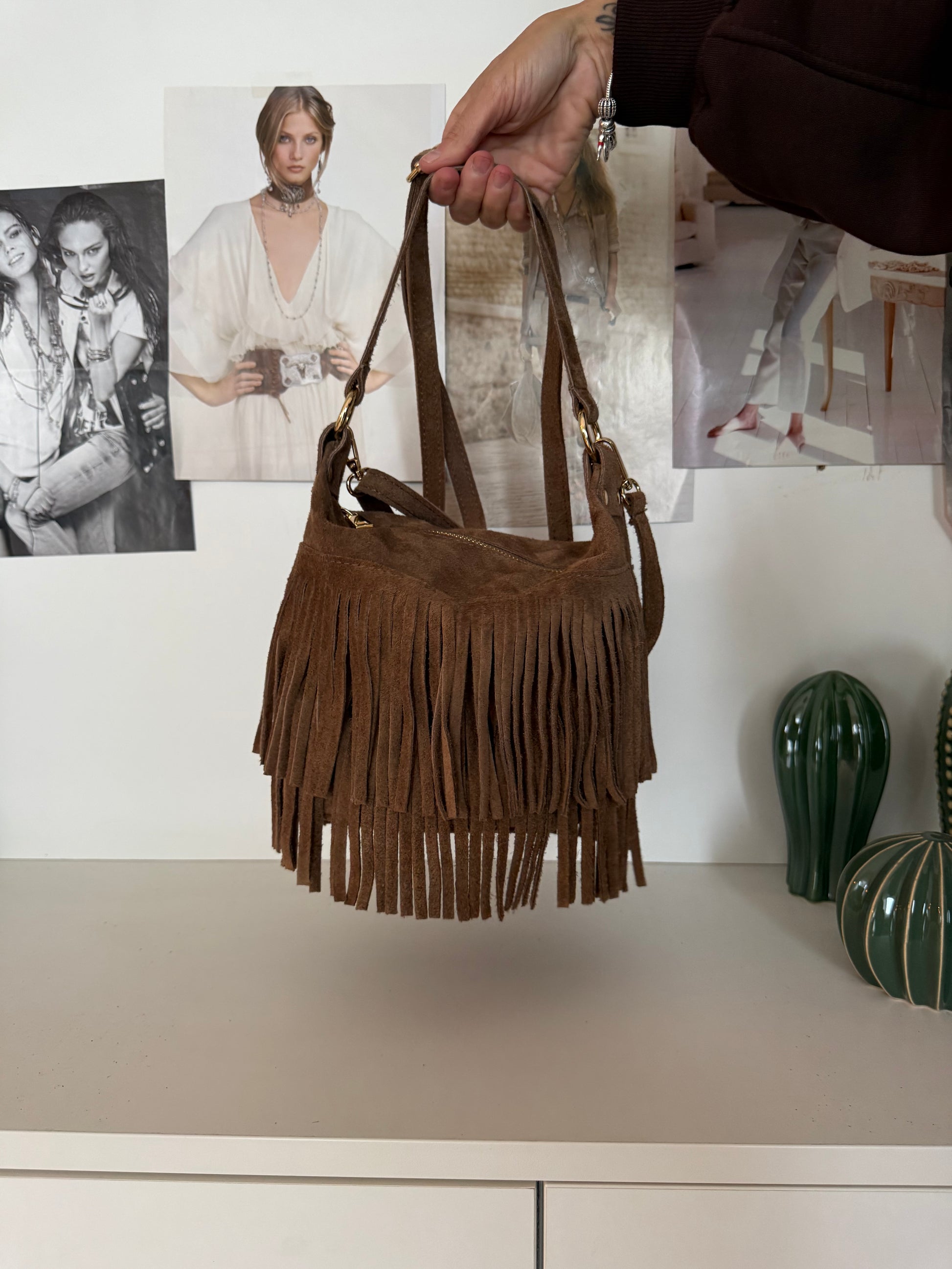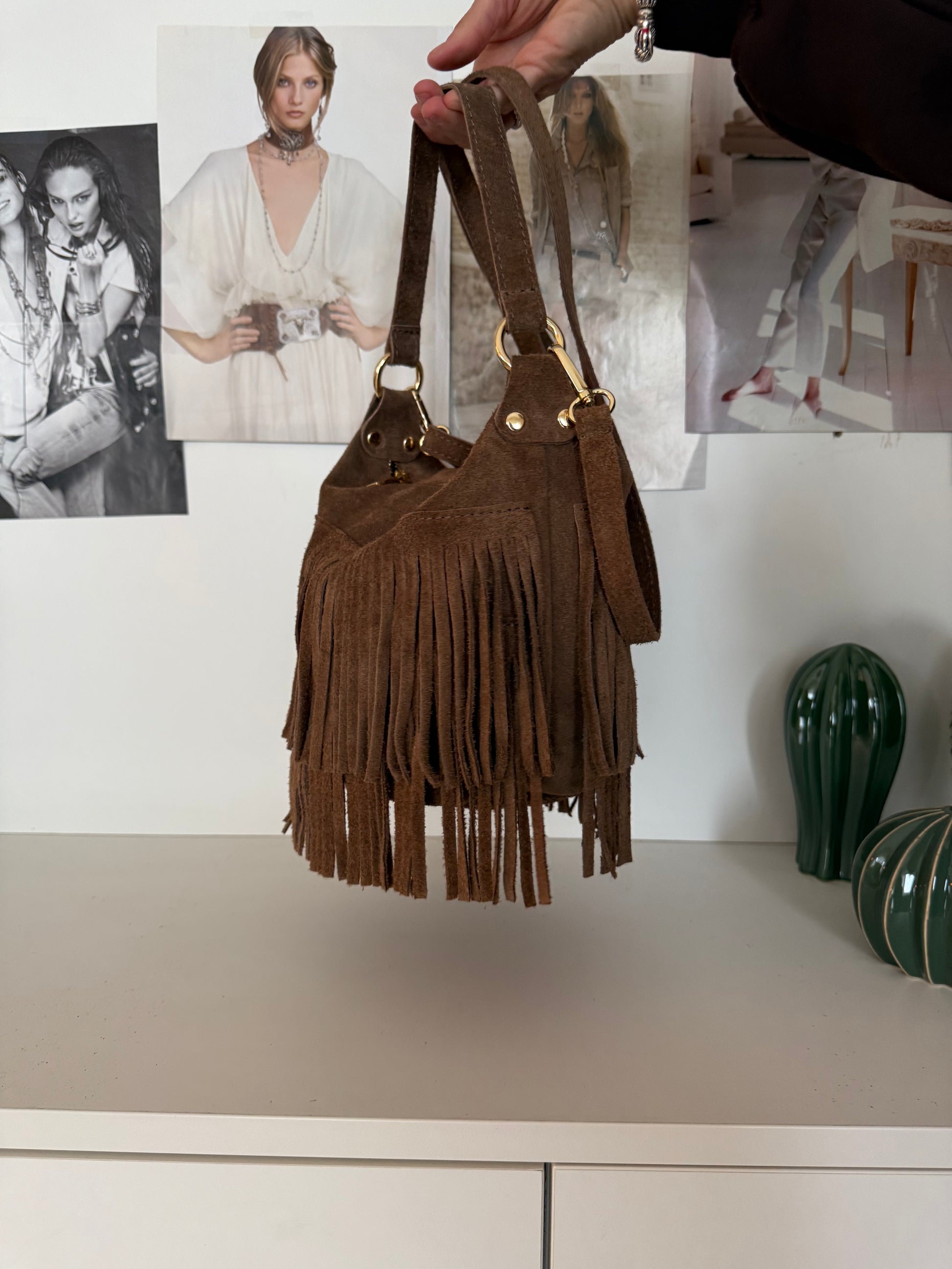 Borsetta “secchiello” scamosciata con frange - Biscotto - in vera pelle