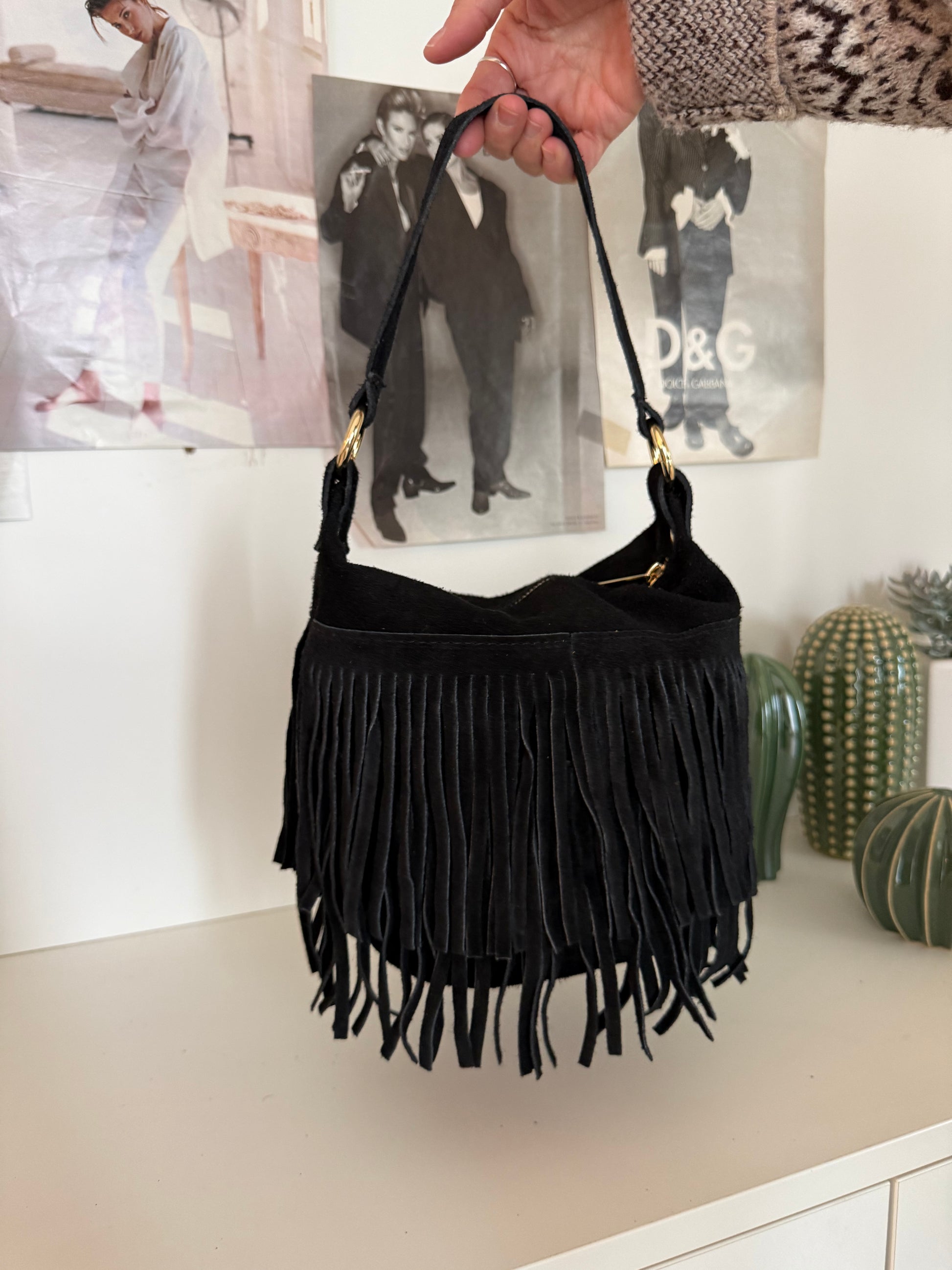Borsetta “secchiello” scamosciata con frange - Nero - in vera pelle