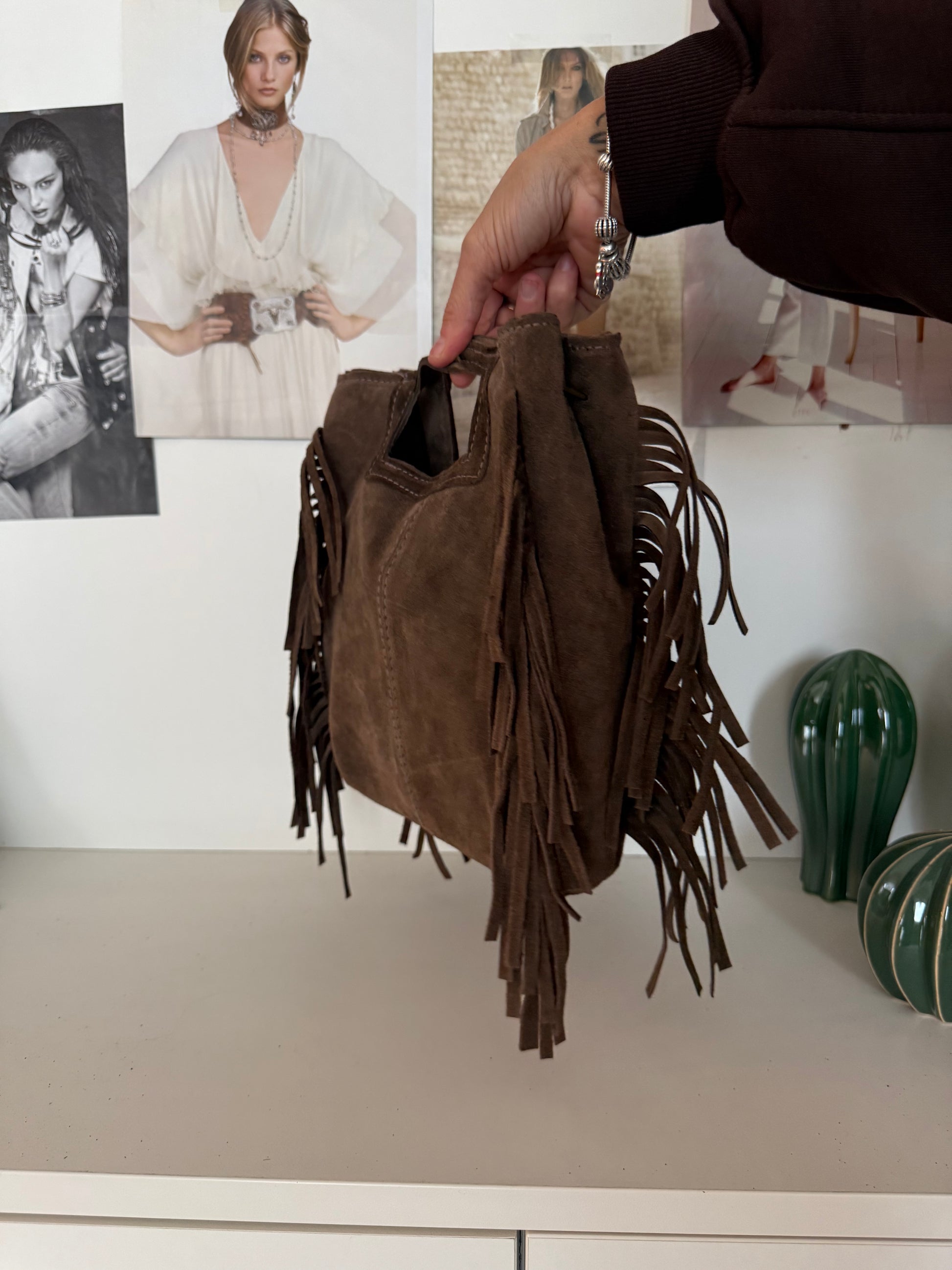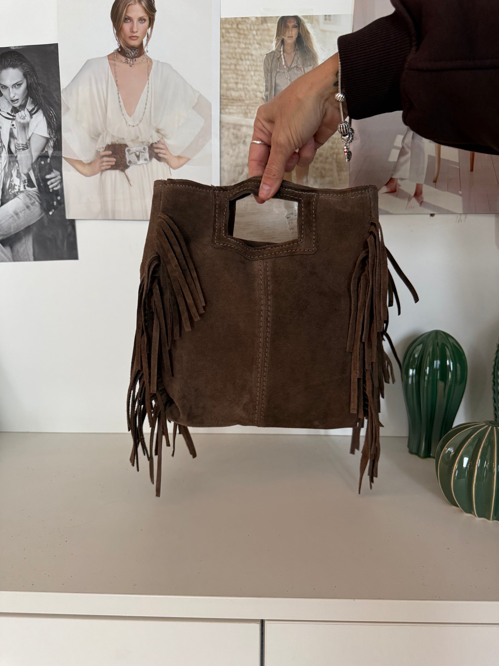 Borsetta “square” scamosciata con frange - Fango - in vera pelle